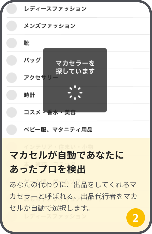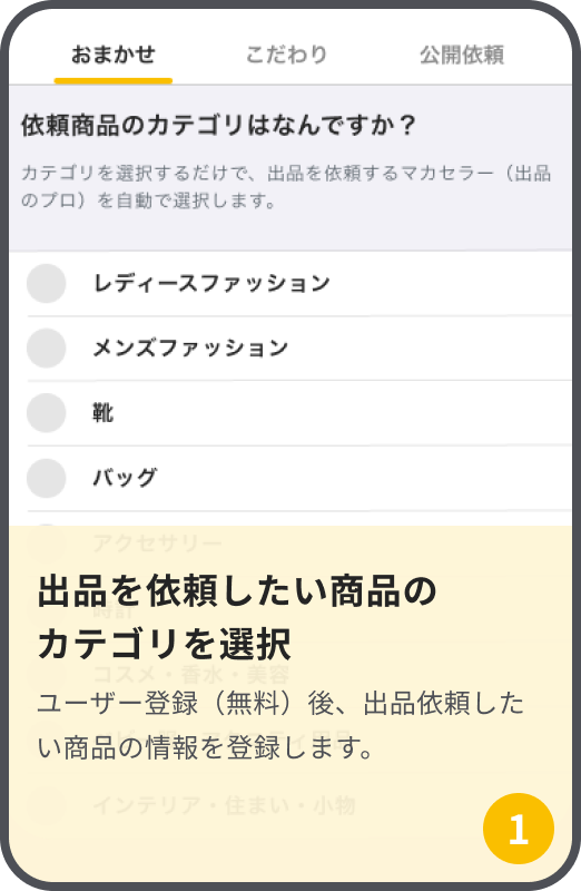 お願いしたい商品のカテゴリを選択するだけ。あとは自動でプロとマッチング。手数料も一律固定なので安心です。